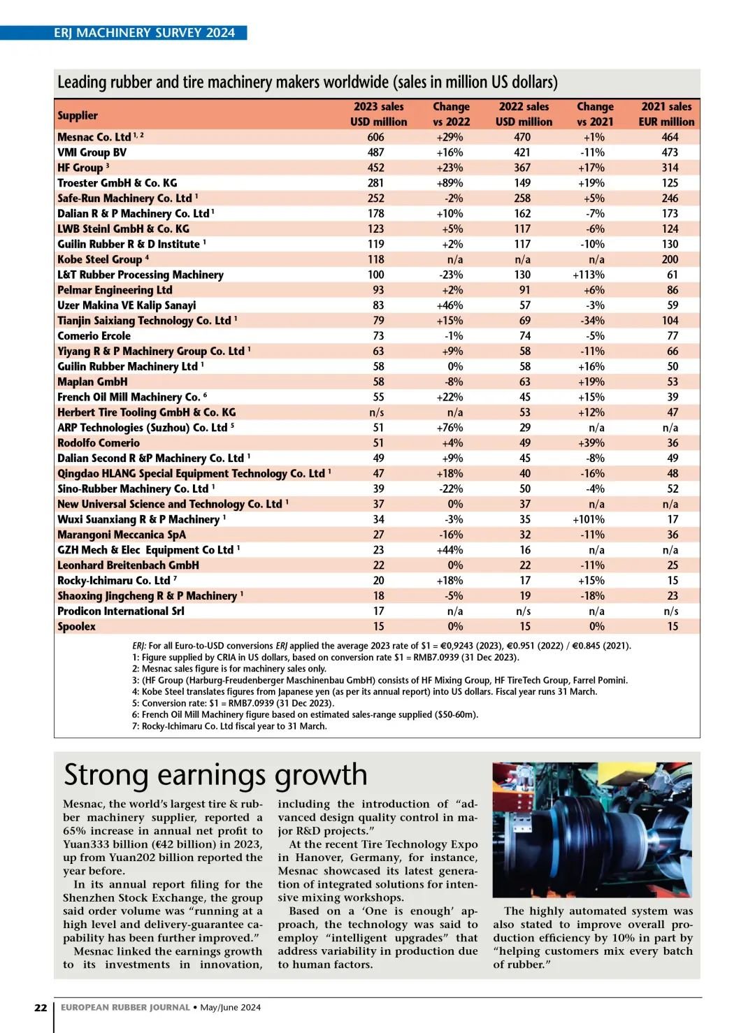 在最新出版的欧洲橡胶杂志(European Rubber Journal) 5/6月刊,公布了2023年全球橡胶机械行业企业的销售收入排名,6686登录入口(MESNAC)蝉联榜首。