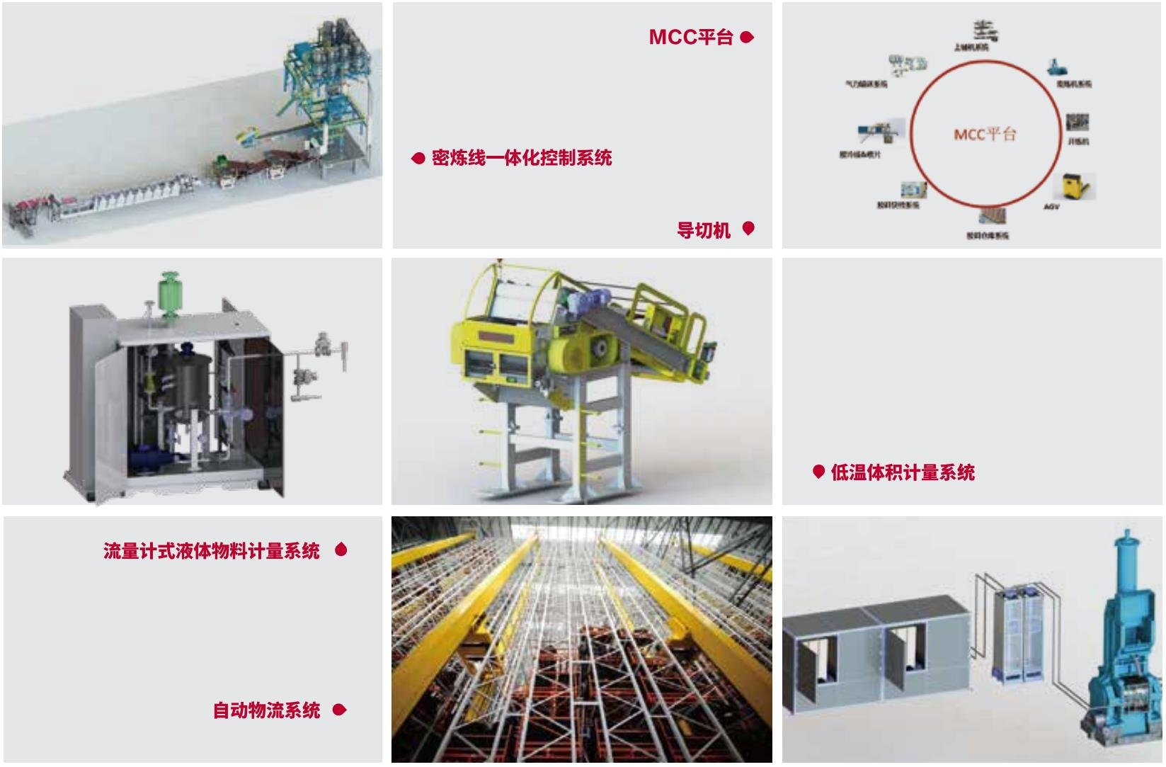 通过密炼机上辅机系统、高精度称量配料系统、生胶切粒均化系统和自动翻胶系统等先进自动化装备实现车间自动称量和自动生产,运用AGV、RGV、EMS、机器人和立体库等先进自动化仓储物流设备实现车间自动物流和自动存储,结合条码、RFID、MES和机器人等先进信息化技术实现车间信息化和数字化,运用人工智能、大数据分析、APS高级排产算法等智能技术实现车间智能生产和智能服务,为客户提供高效率、高质量、低成本、低能耗、绿色环保的智能炼胶车间。