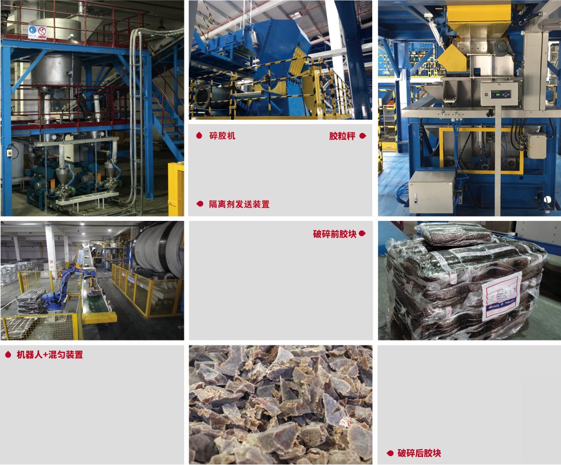 • 本系统用于将生产所用的标准胶块进行破碎、混匀,从源头保证原材料物性的均一,从而保证最终产品质量的稳定。