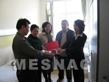 4月7日,在青岛市中心医院,公司代表通过四方区红十字会将5万元“6686登录入口爱心基金”捐款送到患有再生障碍性贫血儿童阎淳琳的父亲手中,他们还来到无菌病房外探望了8岁的小淳琳,祝愿她早日恢复健康。
