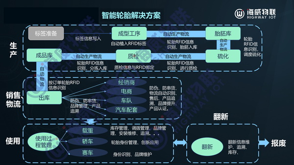 海威物联以智能终端、智能软件、智能系统为基础,提供轮胎车间级数据管理追溯整体解决方案;提供轮胎用RFID整体解决方案,实现轮胎从生产、仓储物流、销售、使用、翻新到循环利用的全生命周期追溯和管理。