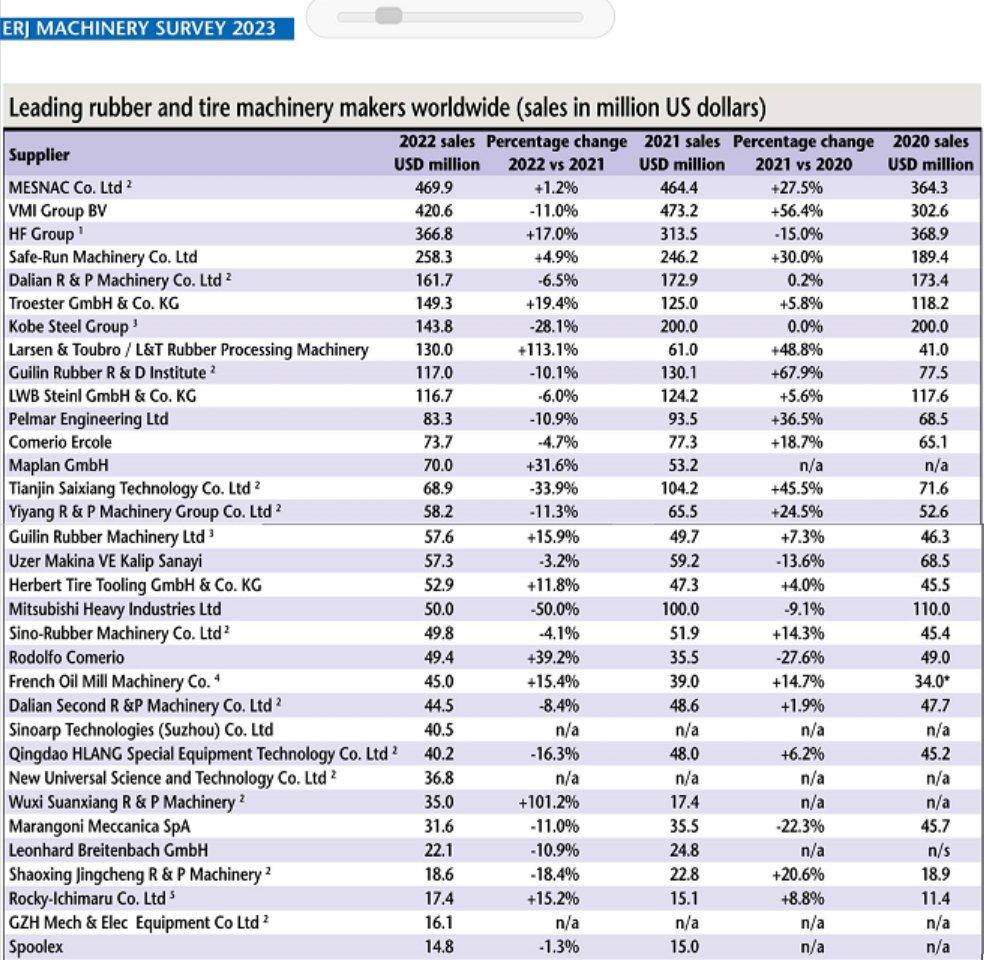 在最新出版的欧洲橡胶杂志(European Rubber Journal) 5/6月刊,公布了2022年全球橡胶机械行业企业的销售收入排名,6686登录入口(MESNAC)位居第一。